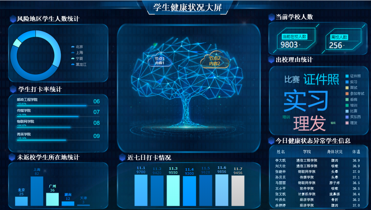 这是我拿FVS制作的学生健康状况大屏,大概花了一下午吧,因为是第一次用不太熟悉,后续再用的话效率肯定蹭蹭往上涨。