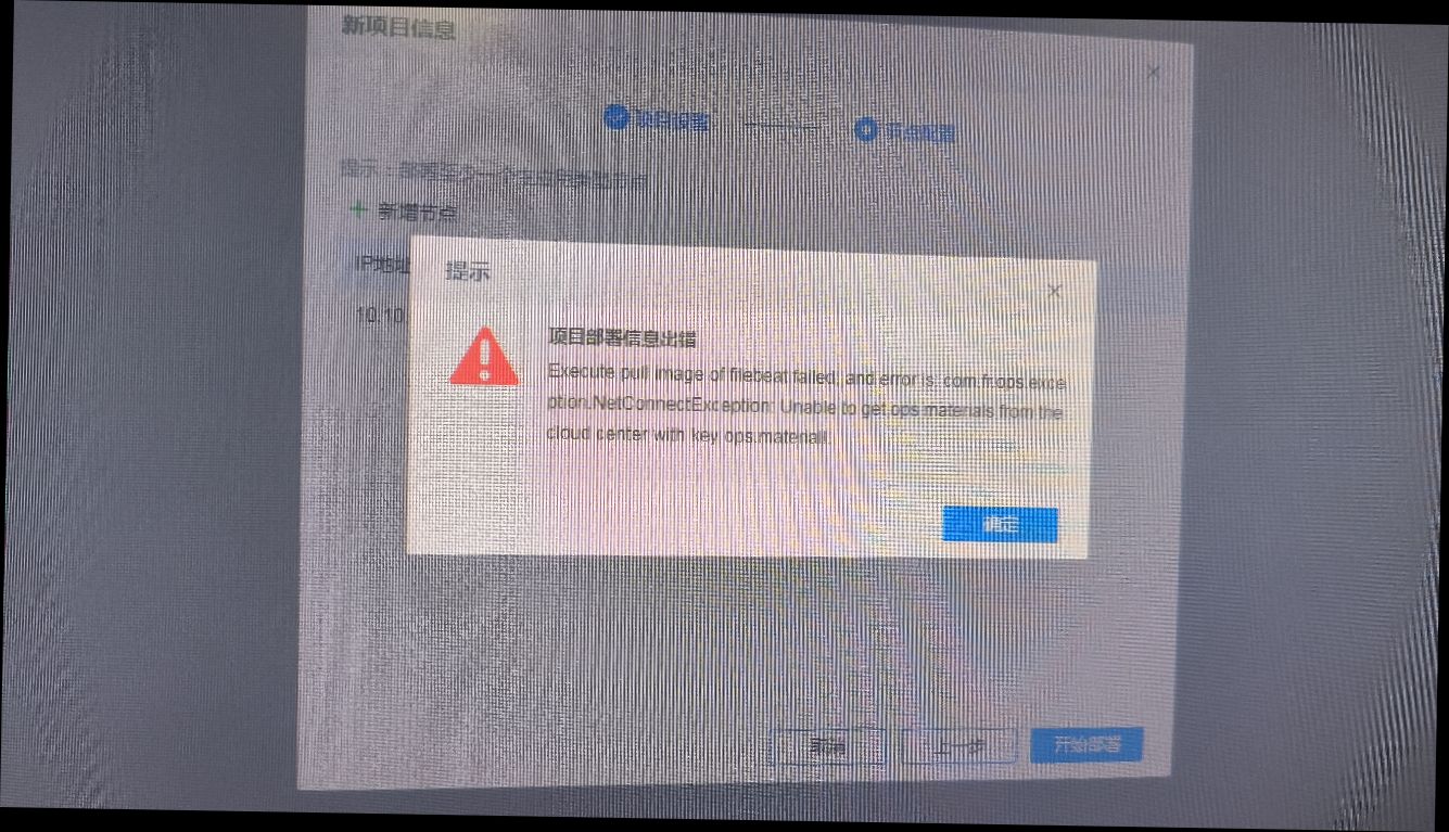 部署新的finereport时,提示报错:Execute pull image of filebeat failed, and error is: com.fr.ops.execption.NetConnectException: Unable to get ops materials form the cloud center with with key ops.material!.
