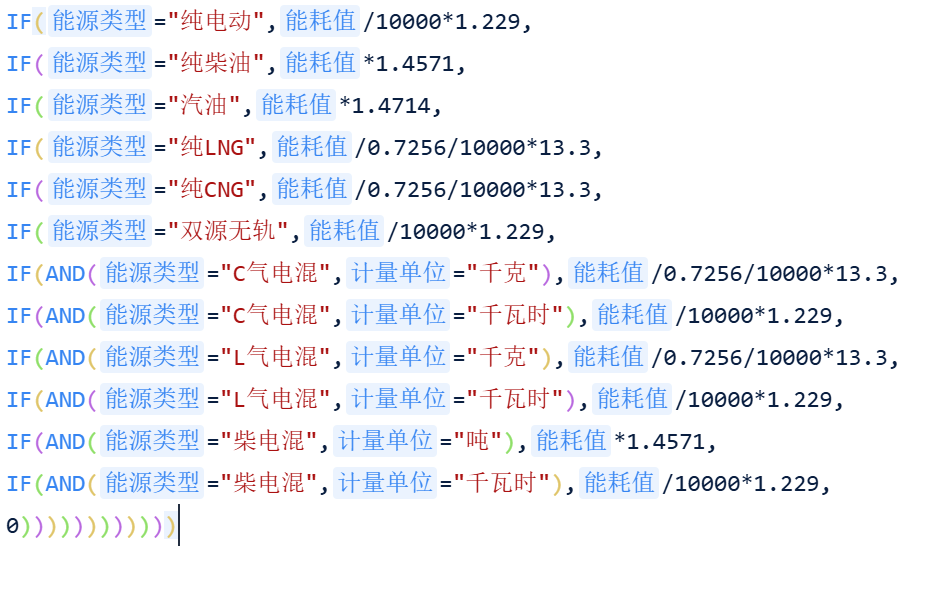 由于各能源类型使用的能源不同,为了便于比较,需要将不同能源进行折合成标准煤,不同能源之间使用的折标系数不同,但是数据中只有“能耗数值”这一个字段,因此新增了公式列,使用IF关系对不同的能源类型进行分别折合标准煤。同时由于混合动力车辆使用两种能源,新增了AND关系进行同步计算。