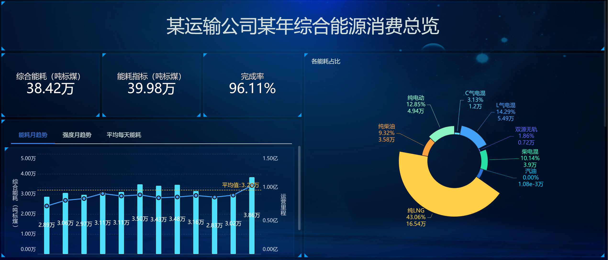 总体上用KPI指标卡展示总能耗目标、目标值以及目标完成率,再按能源类型使用饼图展示各能源的占比,最后使用柱状图展示各月的能耗趋势、能耗强度趋势,以及平均每天的能耗趋势。