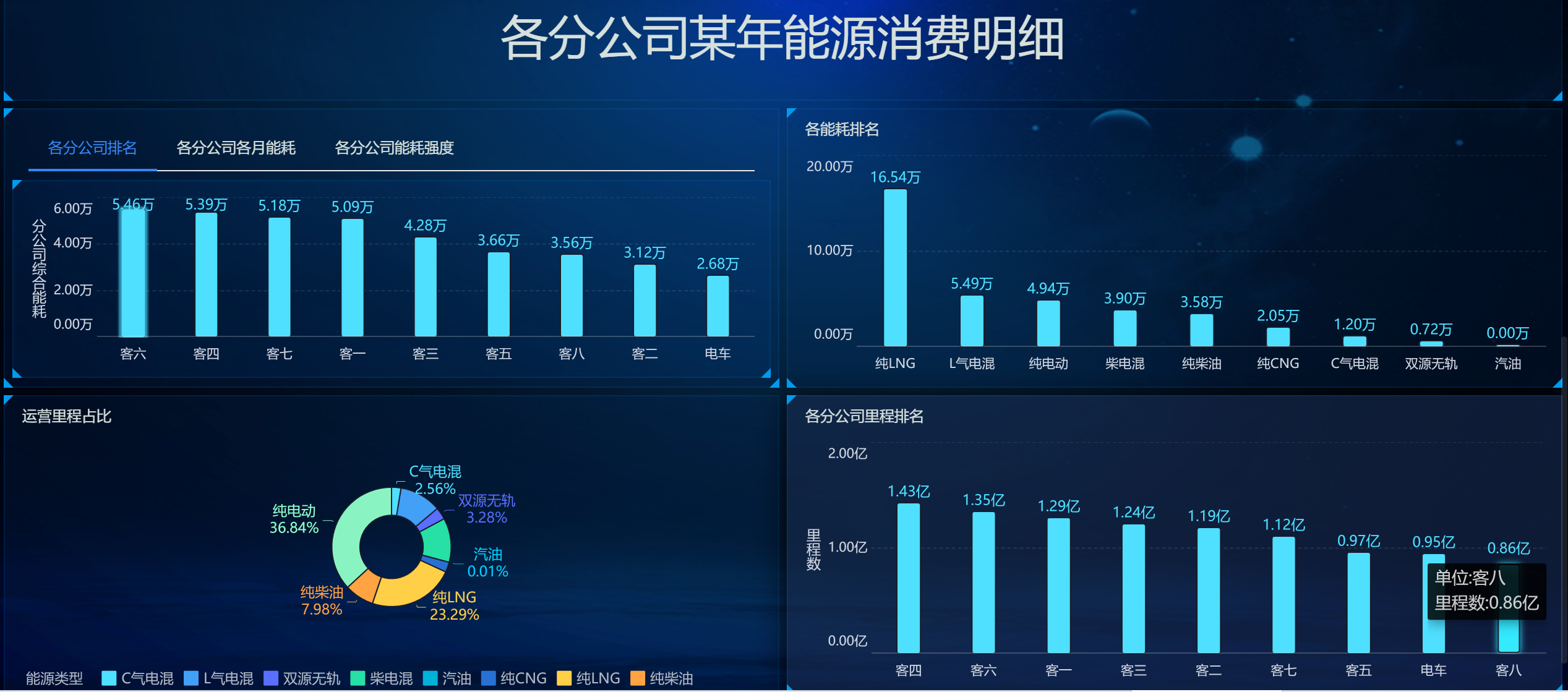 最后,按照实际管理单位(分公司)维度进行细化展示。主要使用柱状图,对各分公司的总体能耗进行排名,对各月的能耗趋势进行分析,对各分公司的能耗强度进行分析,以及各分公司贡献的运营里程进行排名。