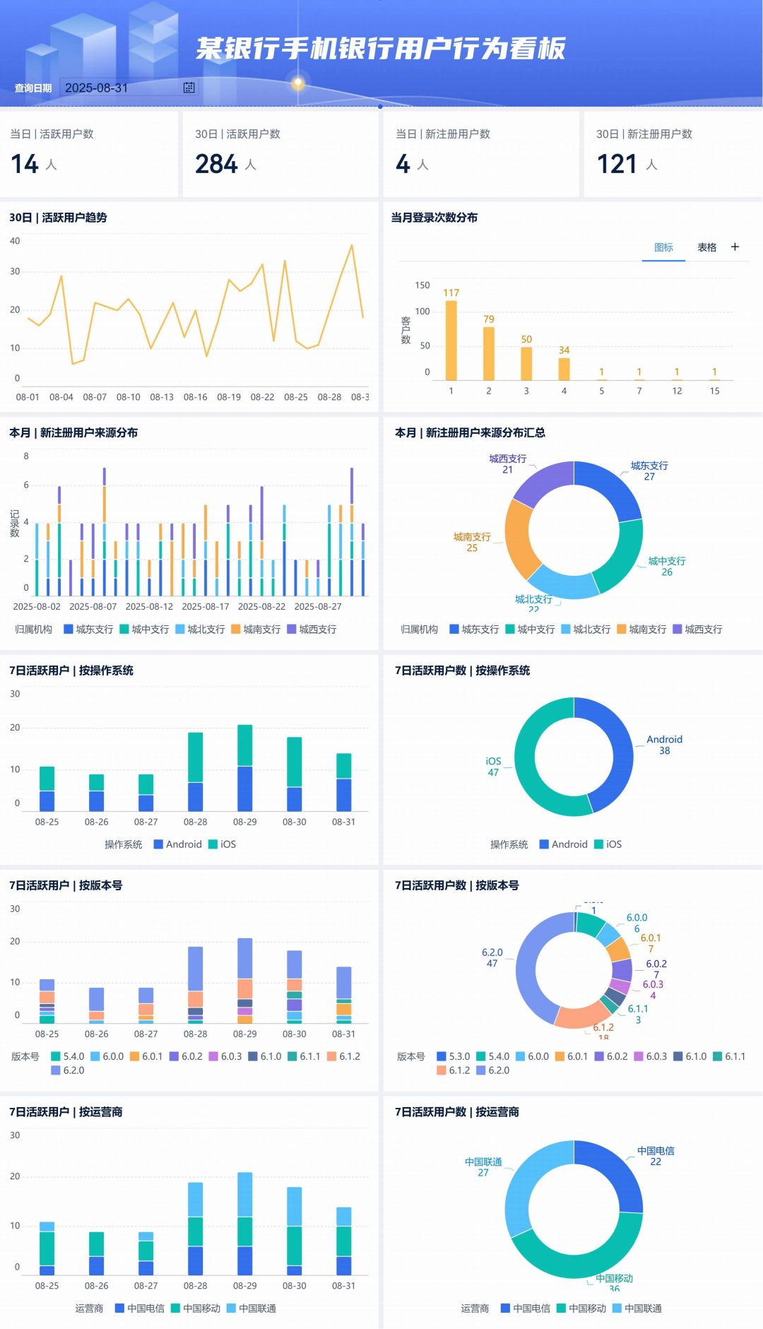 仪表板采用总分结构布局。顶部为关键指标卡,分别展示当日和30日内的活跃客户数以及注册用户数。中部为分析主体,分别是新注册用户分析情况以及活跃客户分析情况。整个报告布局清晰,逻辑流畅。
