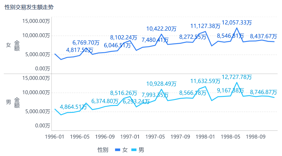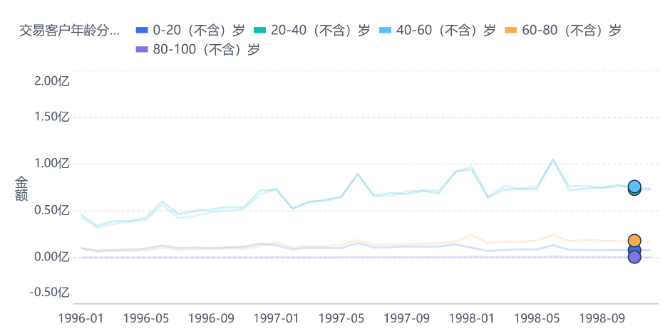 我们发现20-60岁的客户是交易最活跃的群体,并且1993-1998年交易发生额持续走高。1993-1998年男性交易发生额持续走高,且男性交易高于女性