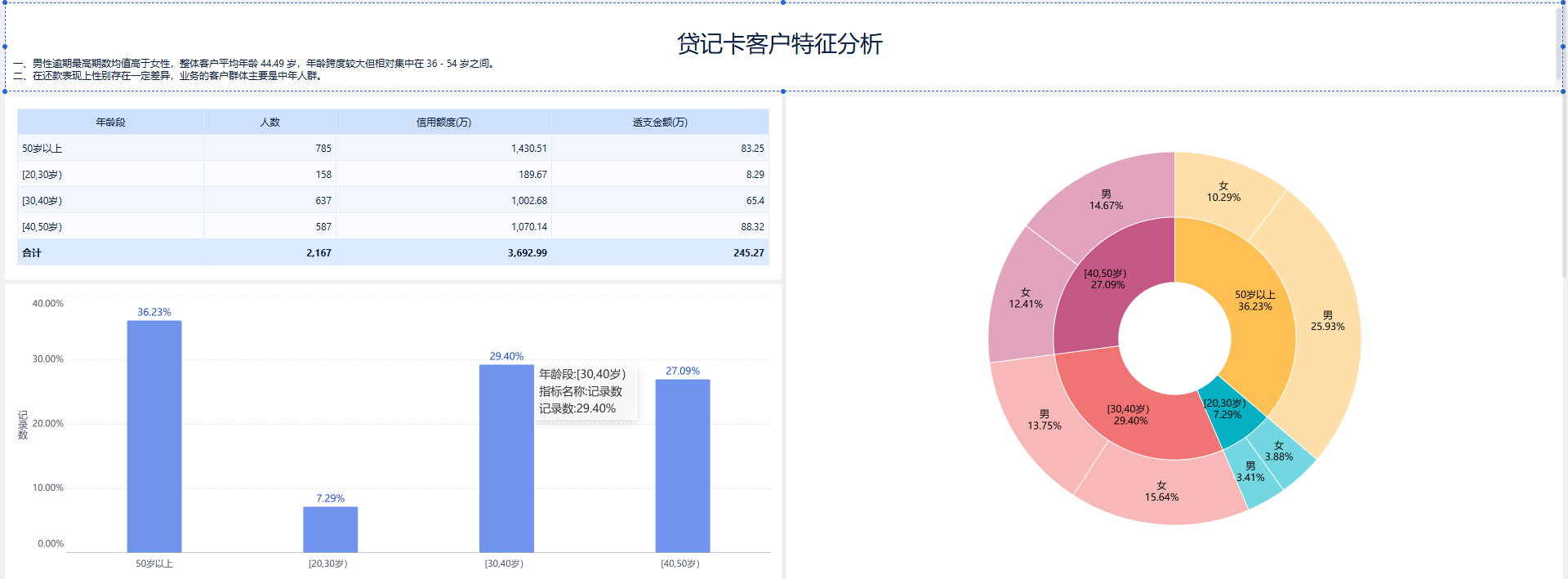 掌握FineBI各类可视化组件的应用场景与配置方法,包括柱状图、折线图、饼图、仪表盘、表格等,能根据分析目标选择适配的图表类型。以实践作业为例,针对“贷记卡客户特征分析”场景,用饼图展示客户年龄、性别构成占比、用表格呈现各年龄段额度及透支金额明细,实现“趋势-结构-明细”的多层级数据呈现,让分析结果更直观易懂。