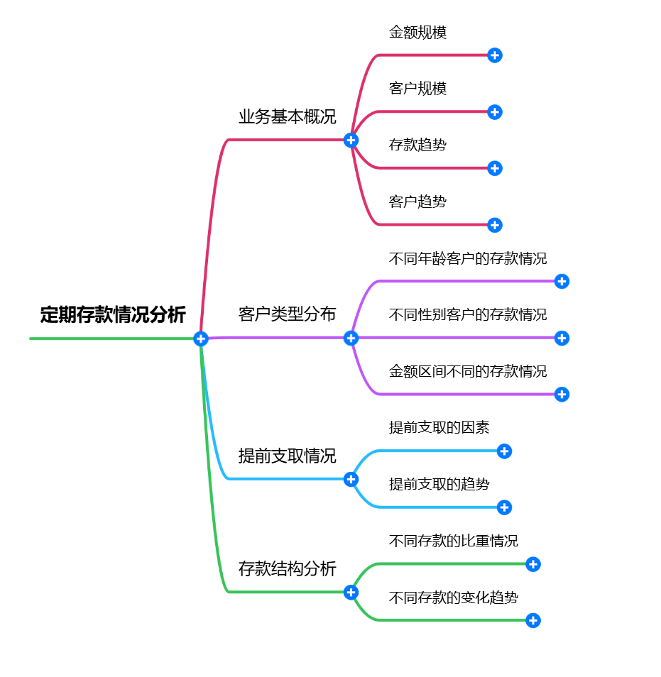 首先明确分析目标,对存款的整体情况进行分析解读,其次从客户类型等特征进行分析影响存款的因素,接着分析未持有存款而提前支取的行为,以此来减少存款流失,最后通过分析存款结构来优化存款产品,保证业务的可持续发展。具体思维导图如下: