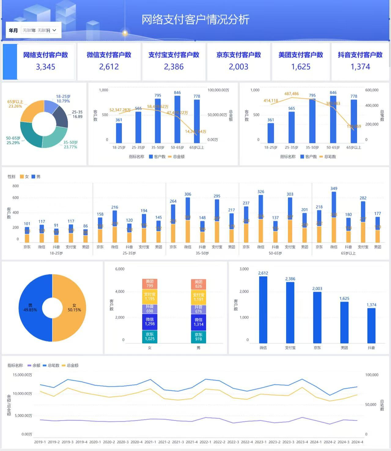 仪表板采用总分结构布局。顶部为KPI关键指标卡,主要展示网络支付客户数,各渠道客户数。