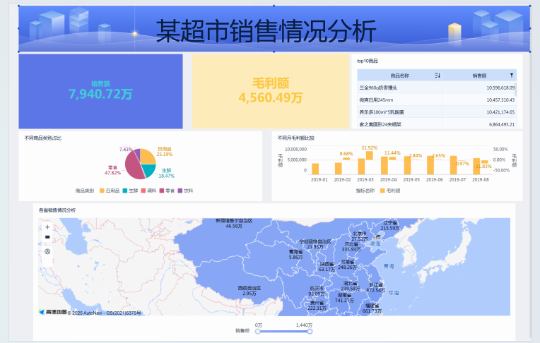 我司为超市销售管理人员提供数据服务,核心目标是监控销售业绩、分析出客户选购的排名前10的商品,分析该超市的销售产品类别、种类,为下年的营销策略制定提供数据支持。作为对接该客户的分析师,我需要协助营销团队完成月度经营分析报告,并进行数据洞察汇报,通过 FineBI 搭建一套自动化的经营分析看板,实现数据实时更新、多维度分析和直观可视化呈现。