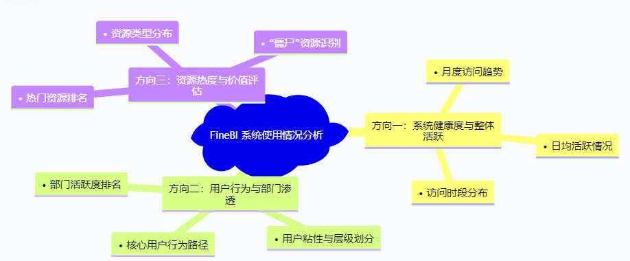 - 拿到上述数据表后,我的分析思考过程如下。核心目标是评估系统健康度、洞察用户行为、优化资源配置。我将其拆解为三个分析方向,其结构脑图如下: