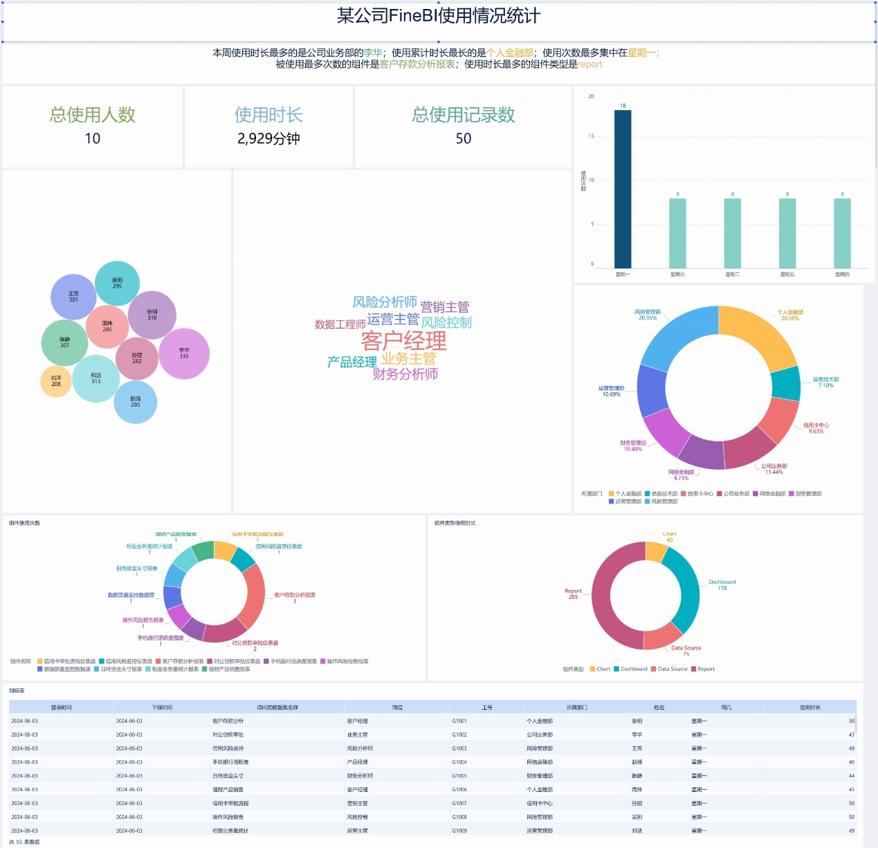 使用时长最多的是公司业务部的李华;使用累计时长最长的是个人金融部;使用次数最多集中在星期一;被使用最多次数的组件是客户存款分析报表;使用时长最多的组件类型是report。