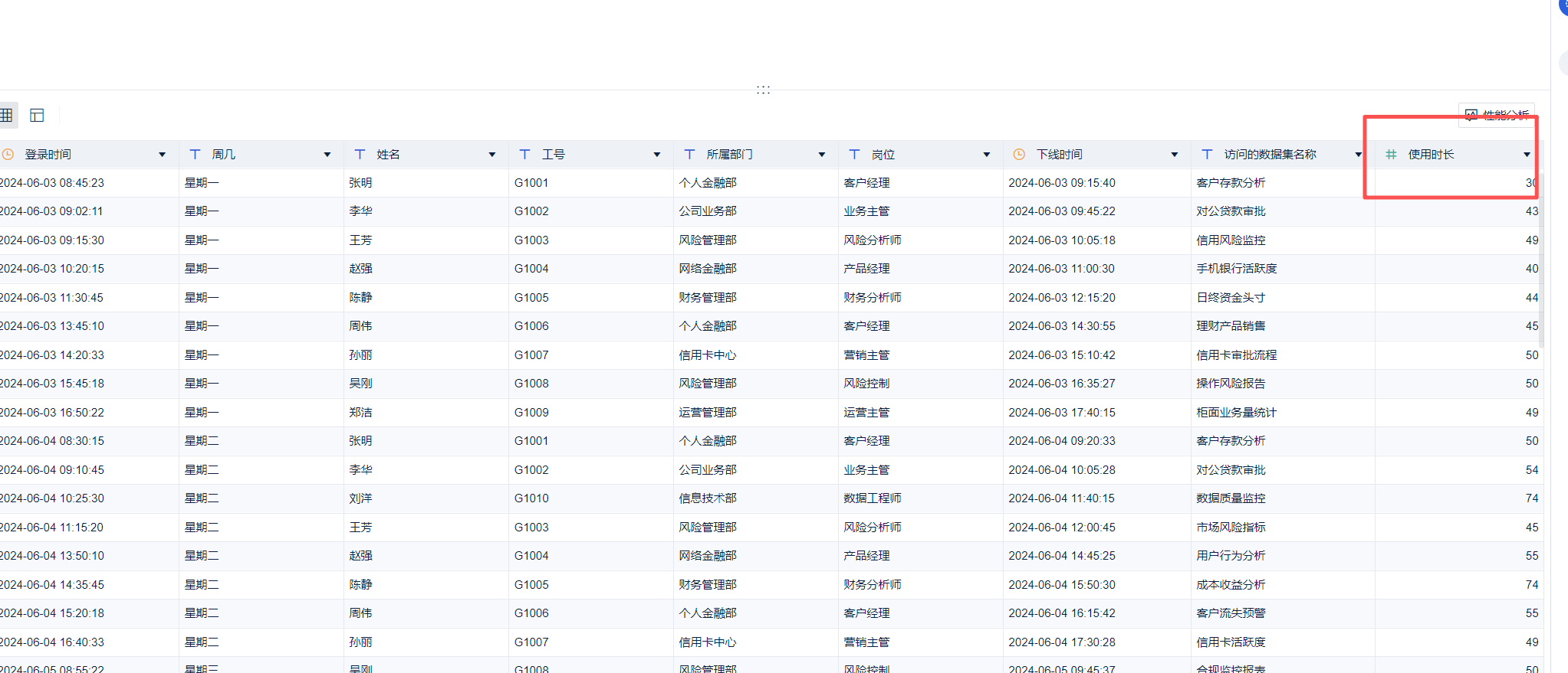 针对使用时长最长的个人金融部,BI管理小组可以派遣专人到部门服务,或者进一步培训,提升BI使用效能。