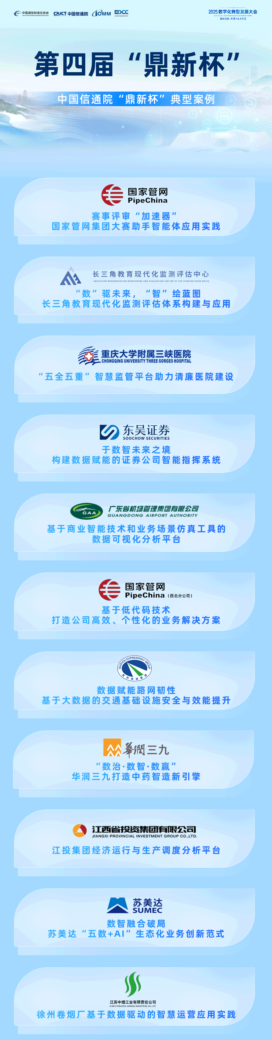 近日,由中国通信标准化协会主办、中国信息通信研究院(简称“中国信通院”)承办的“2025数字化转型发展大会”在北京中关村国家自主创新示范区展示中心隆重开幕。大会以“数智深融·共谱十五五新篇”为主题,汇聚了来自政、产、学、研各界的领导与专家,共同探讨数智技术与实体经济深度融合的发展路径,并重磅公布第四届“鼎新杯”数字化转型应用征集典型案例。