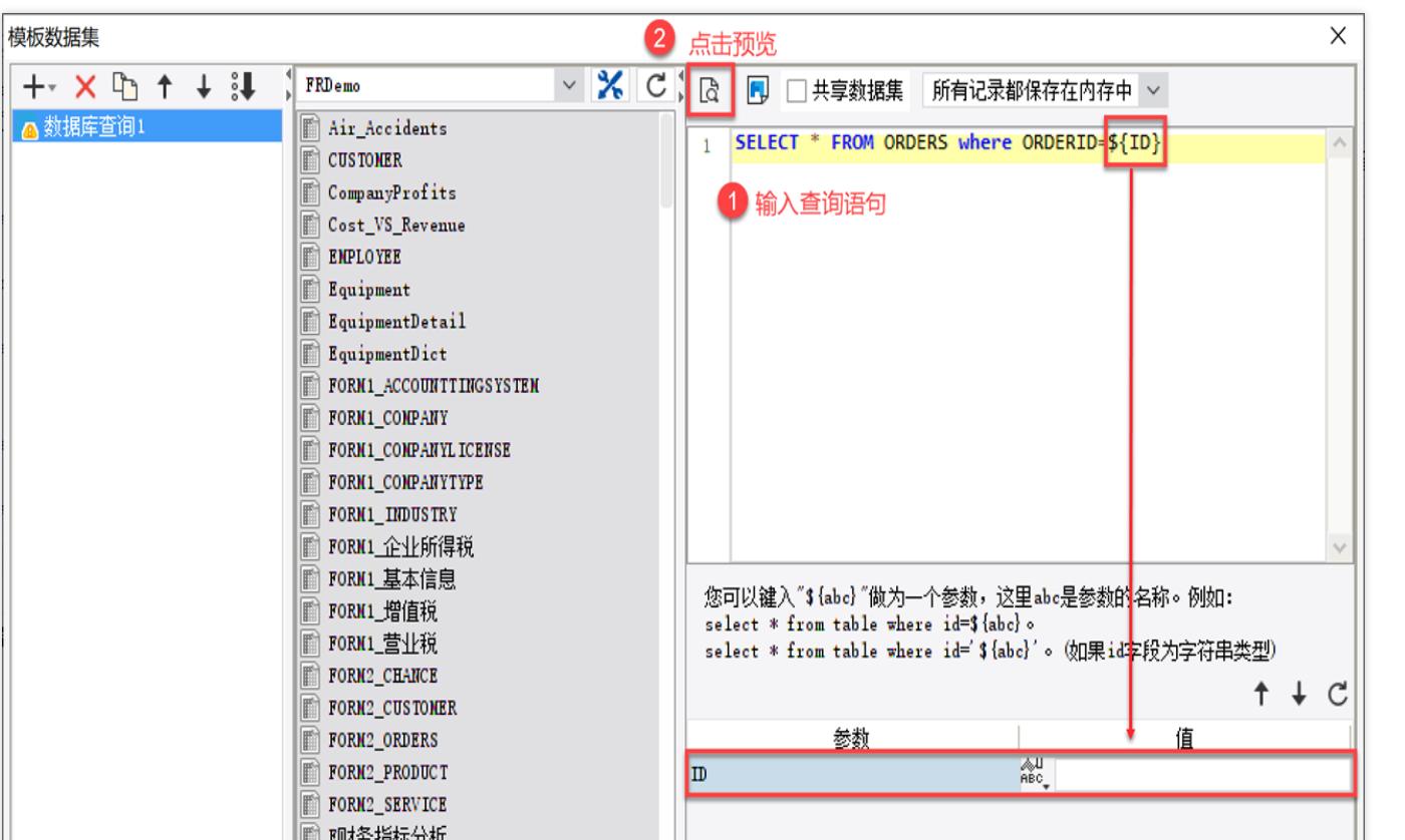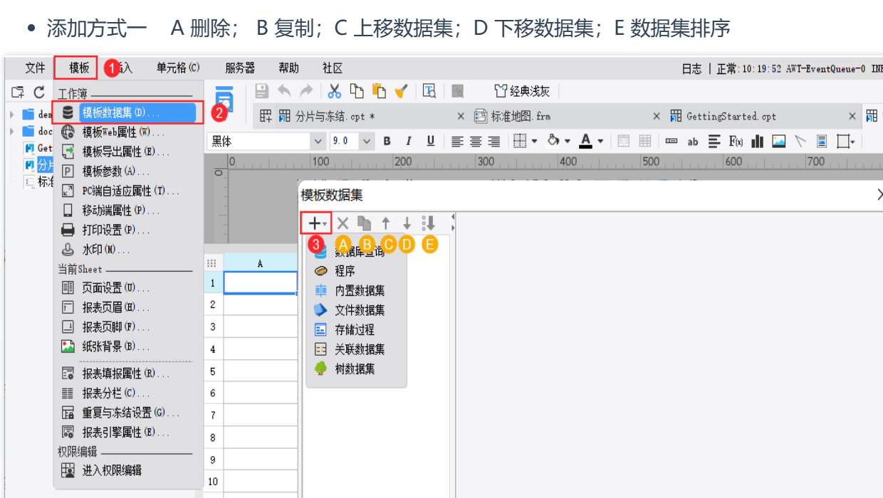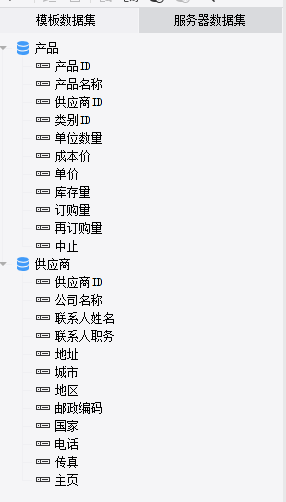 数据集是报表设计时的直接数据来源。数据集按照作用范围分为两种:服务器数据集 和 模板数据集。