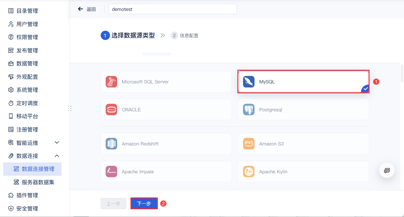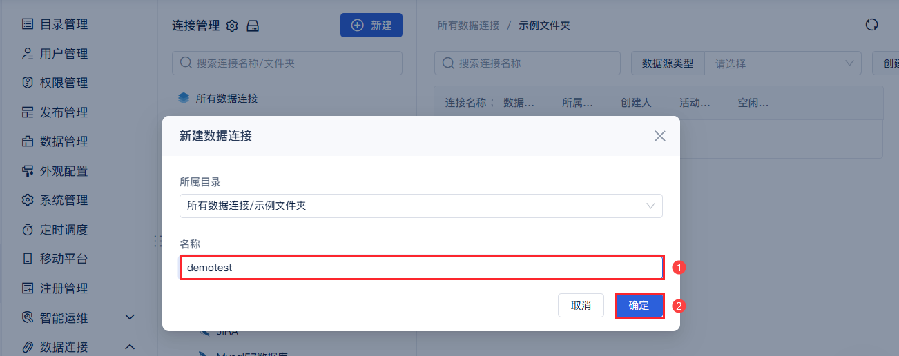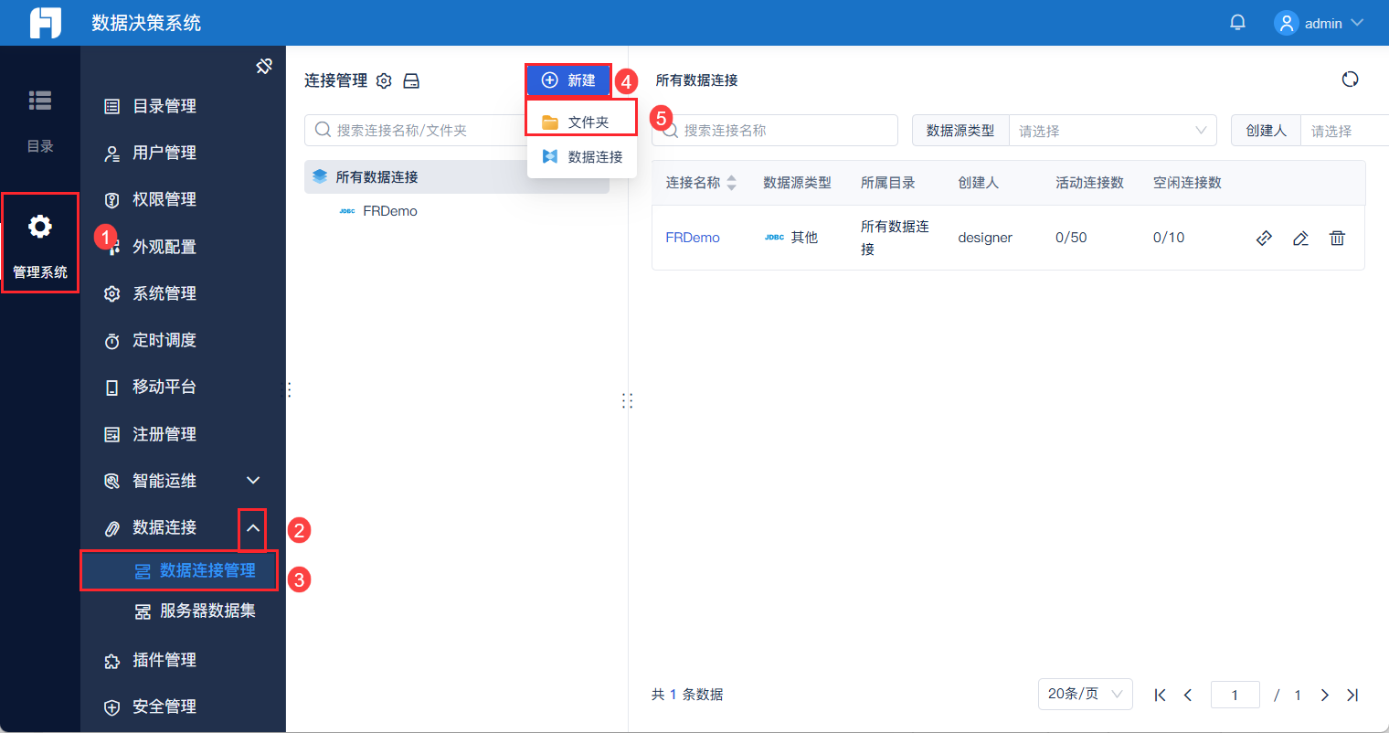 1,管理员进入数据决策系统,点击「管理系统>数据连接管理」页面。点击「新建>文件夹」,可以使用文件夹对数据连接进行分类管理,也可直接创建数据连接。