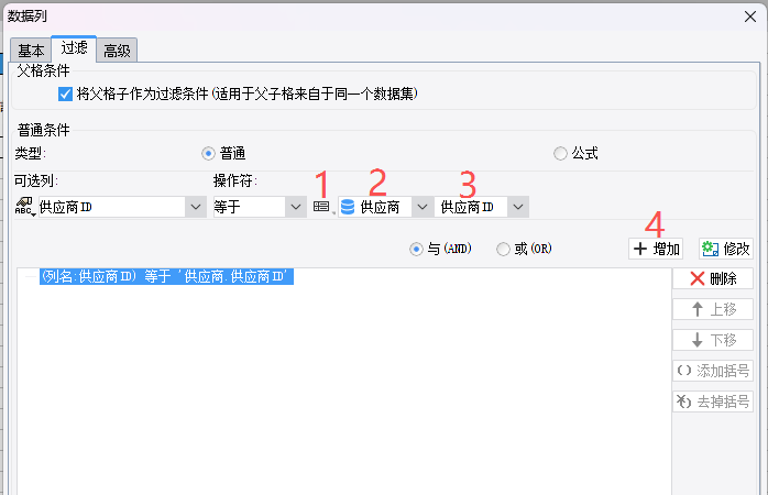 6,选择数据列后右侧第一个为数据集选择“供应商”,后选择供应商ID。点击添加后确定此过滤条件就添加完成了。