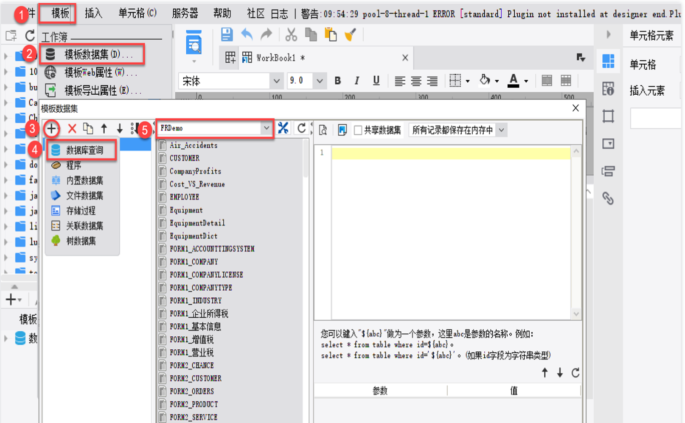 1、点击「模板>模板数据集」,弹出模板数据集对话框,点击模板数据集窗口的左上角的加号按钮,选择「数据库查询」,然后给数据库查询命名,选择所需的数据连接。