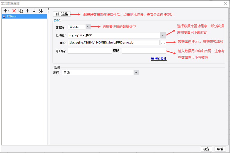 1.1、打开设计器,点击最上方菜单栏中「服务器>定义数据连接」,弹出「定义数据连接」对话框,设计器已经默认连接了一个名为 FRDemo 的内置数据库,点击「测试链接」,弹出「连接成功」提示框,表示数据库 FRDemo 成功与设计器建立连接。