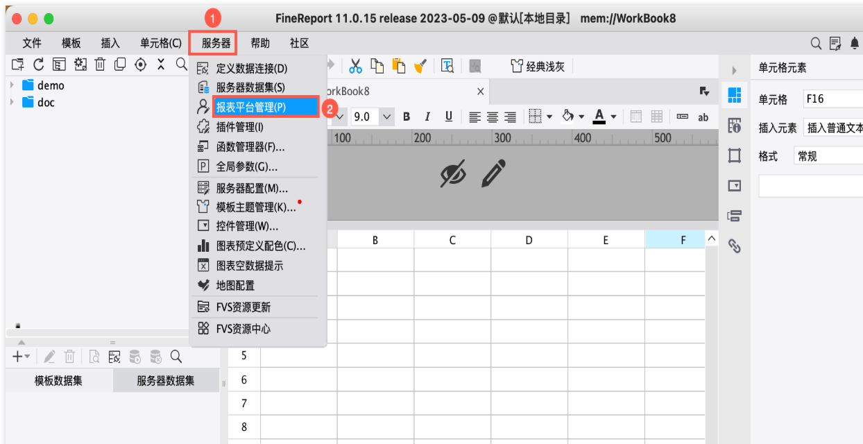 设计器安装后会默认打开管理平台配置页面,如未打开,可以点击 FineReport 设计器菜单栏「服务器>报表平台管理」打开。