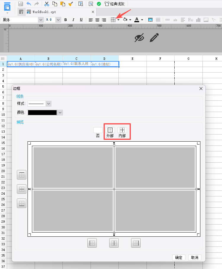 选中这些单元格设置边框并居中对齐(设置同excel),此时单元格拓展方式为默认纵向拓展