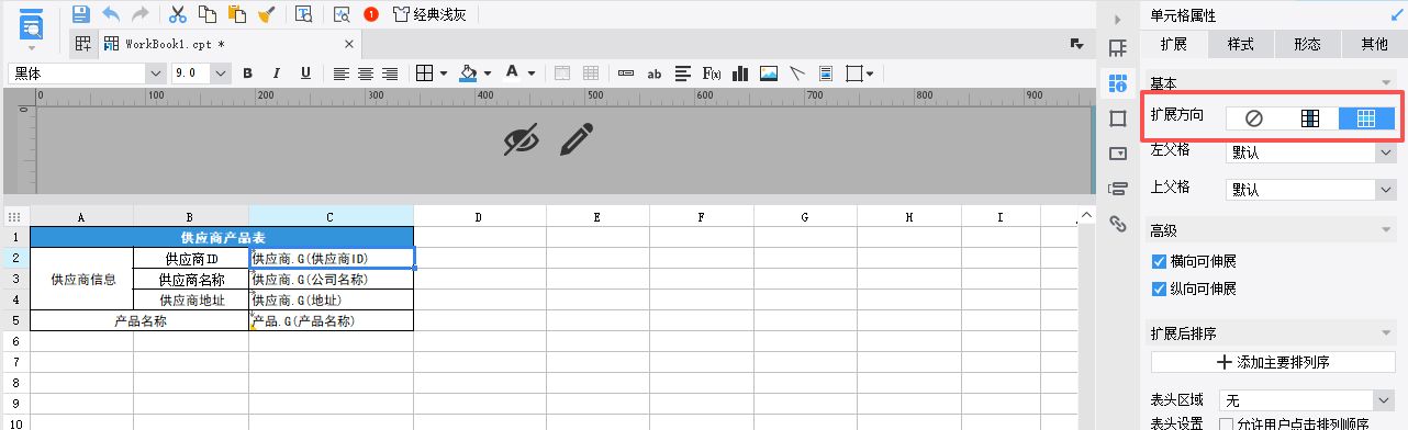 3, A、B列为标题,C列为数据列,将C列供应商相关单元格拓展方向设置为横向拓展,产品单元格为纵向拓展。