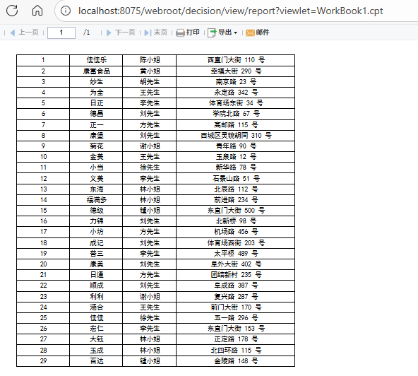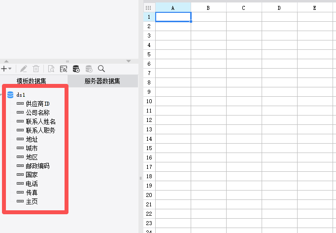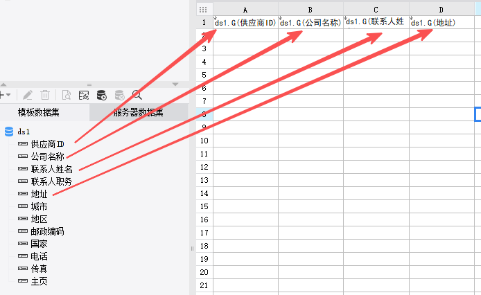 将数据集中需要展示的数据列拖入到对应单元格中。如将供应商id、公司名称、联系人姓名、地址分别拖拽进A1、B1、C1、D1单元格中。