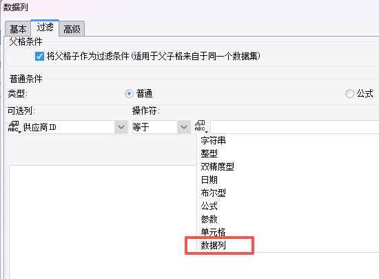 5,此时双击放置产品名称的单元格弹出数据列窗口,选择过滤增加过滤条件,可选列选择产品的运营商ID,操作符“=”,点击“=”右侧 “ABC图标”下拉选择“数据列”。(数据列为模板数据集中的查询sql数据)