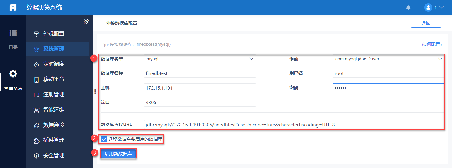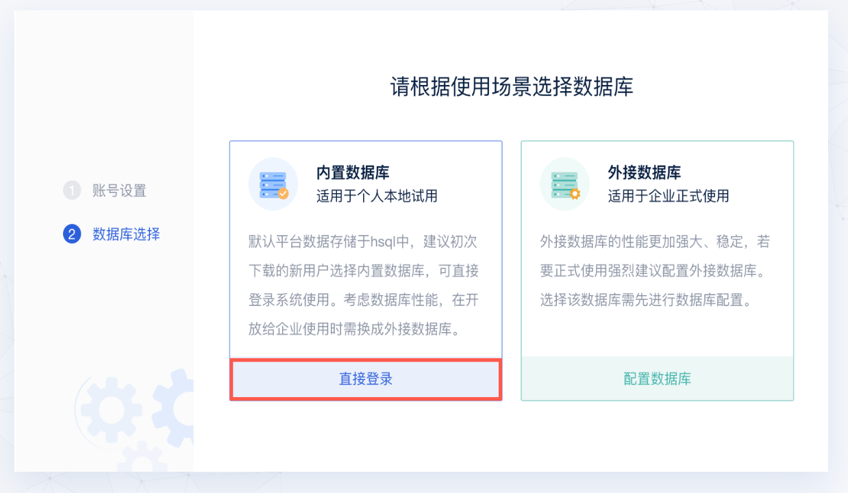 内置数据库可直接登录,外接数据库需配置数据库连接信息等。也可选择内置库登录后进平台再添加外接数据库。