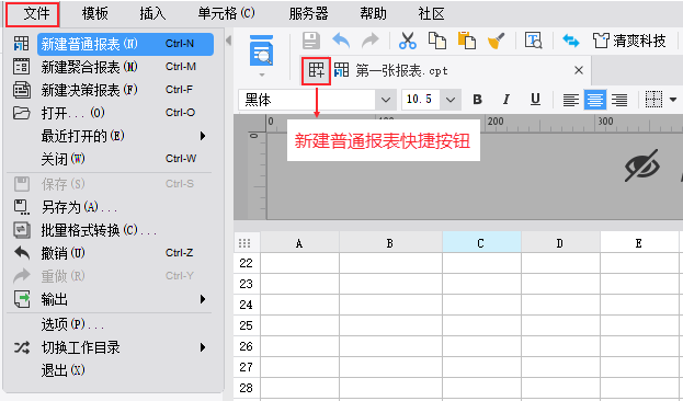 菜单栏点击「文件」可选择新建报表的类型,或点击快捷按钮 编辑,快速新建一张空白的「普通报表」。