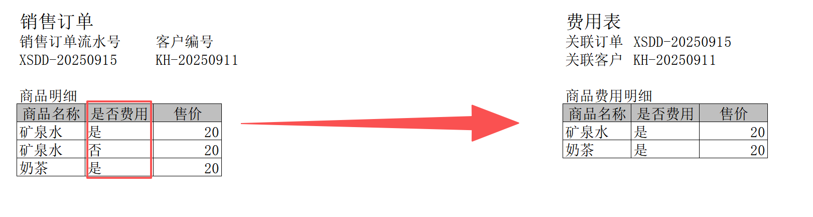 如上图,通过智能助手将订单表的内容插进费用表,其中子表里“是否费用等于否”的子表数据不插进费用表的子表里