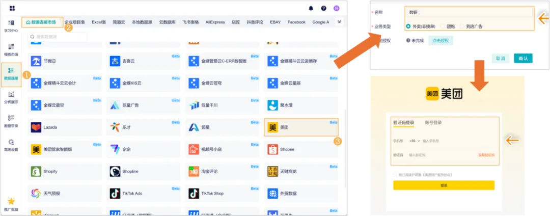 - 登录美团账号后,同意授权,并可看到左侧数据列表