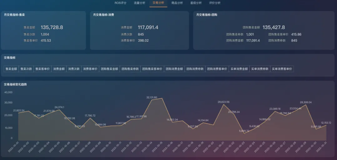 - 团购:团购售卖金额、券数、客单价;团购消费金额、券数、客单价