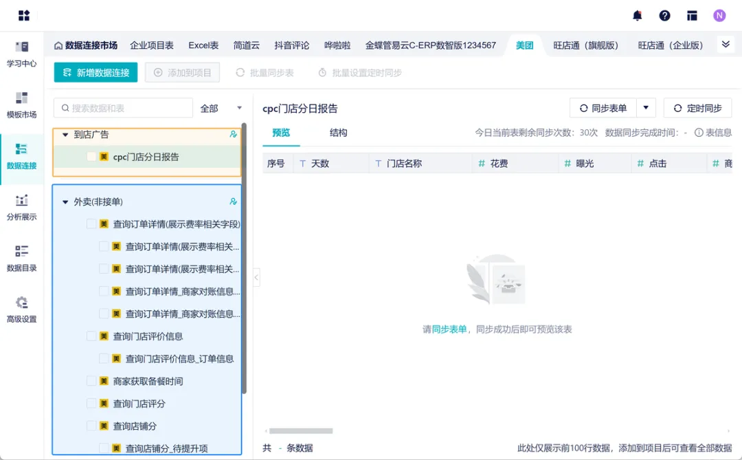 传统方式下,餐饮企业需在平台的店铺后台分别下载数据,再手动在Excel中整合清洗,耗时且易出错。现在,通过九数云BI的数据连接功能,商家可以更高效地获取「美团」和「美团管家·智能版」数据,并进行自动化整合分析。