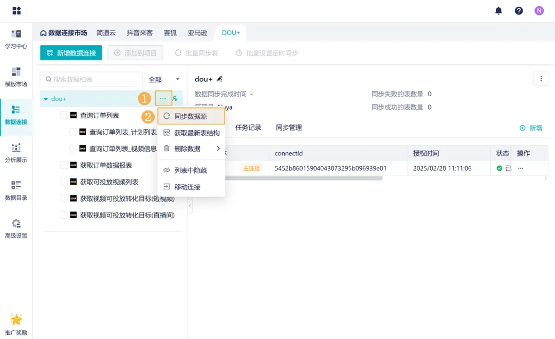 1)在九数云BI的数据连接市场,新增“DOU+”数据源。