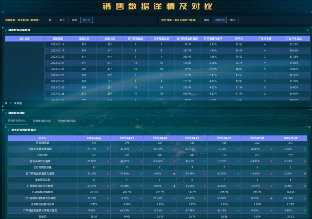 对于跨境运营来说,每日数据分析看板能够一目了然的看到店铺产品的各种细分数据,包括每日之间、每周之间、月度之间的数据对比,实时掌握业务动态,帮助产品优化。