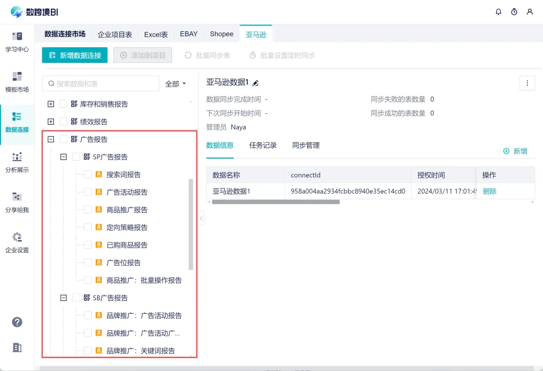 登录数跨境BI,新增亚马逊店铺授权。通过直连的亚马逊数据源获取亚马逊卖家后台的业务报告、订单报告、库存和销售报告等数据。新增亚马逊广告授权,进入授权页面;授权后,在左侧数据列表中,就会新增「广告报告」相关的数据表