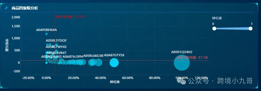 商品四象限分析:以会话次数、转化率、销售额为核心指标,把商品划分为明星商品、潜力商品、问题商品、淘汰商品。这样能让卖家明确:哪些 SKU 值得继续加大投入,哪些需要优化或逐步下架。