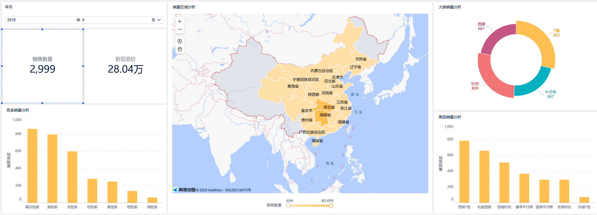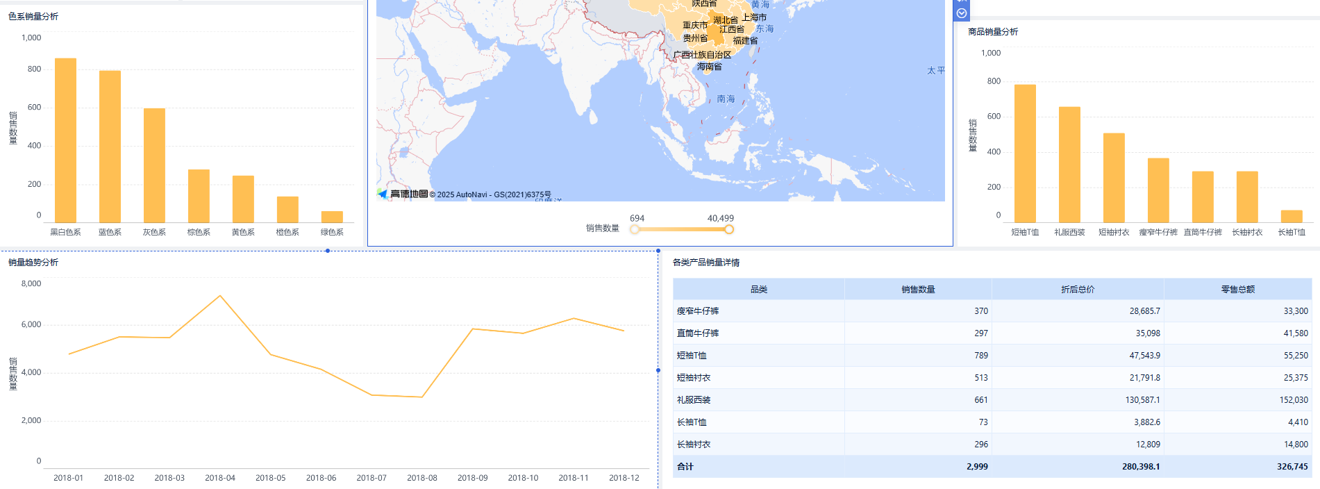 主要是围绕销售数量这个关键性指标做整体的区域上的分析,受欢迎颜色、品类分析,以及销量的年度趋势分析。