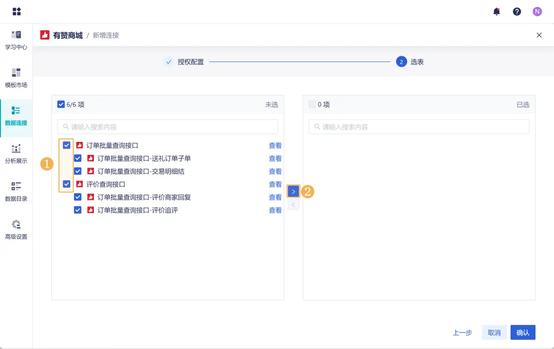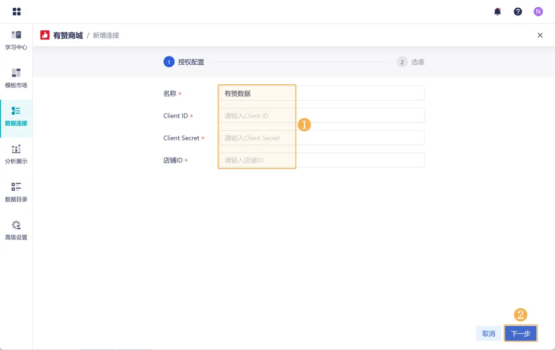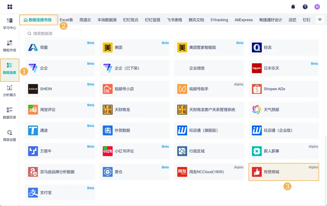 1)进入九数云数据连接市场,新增「有赞商城」数据源