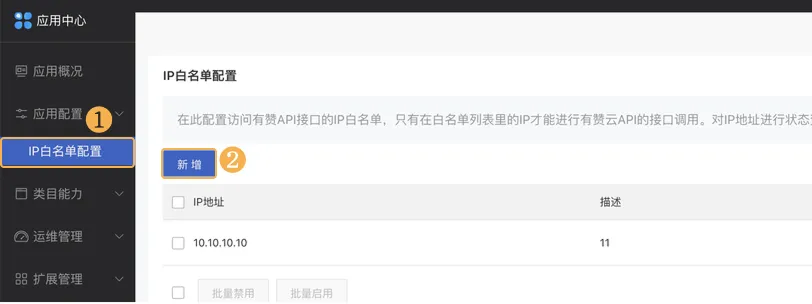 2)根据提示,填写应用注册相关信息,需要等待审核。审核通过后,进入「应用配置>IP 白名单配置」,新增白名单:47.110.75.116、221.228.72.3。如下图所示: