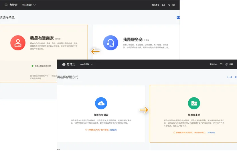 1)注册并登录有赞云,创建一个自用型应用,并选择部署在本地