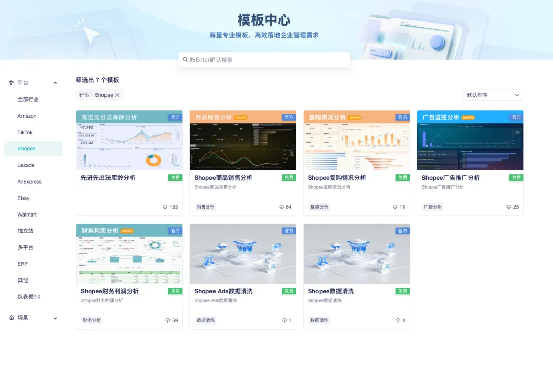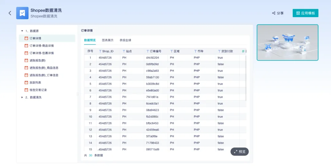为此,数跨境BI在“模板中心”提供了专属的Shopee数据处理模板,所有清洗流程均为标准化自动处理,零代码即可完成数据的清洗与建模。