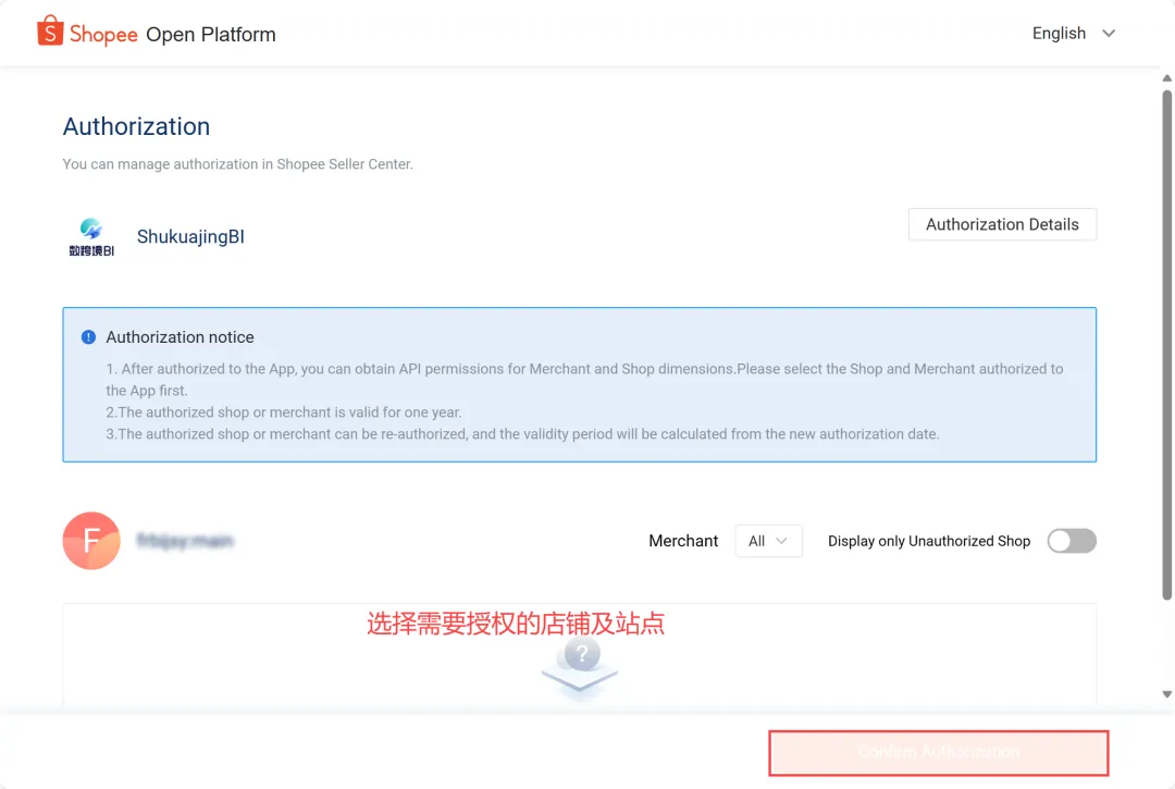 4)选择需要授权的店铺,并勾选授权的站点,然后点击「确认授权」。如下图所示: