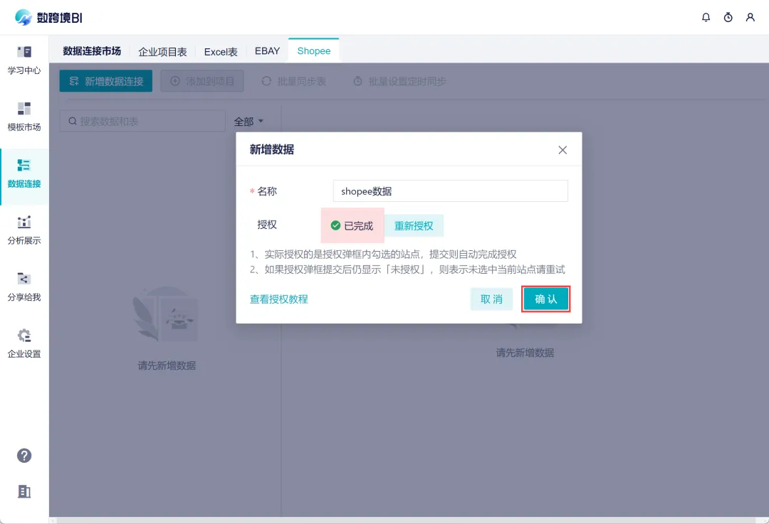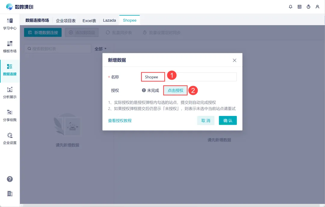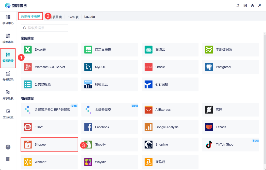 1)在数跨境BI的数据连接市场,新增 Shopee 数据源。