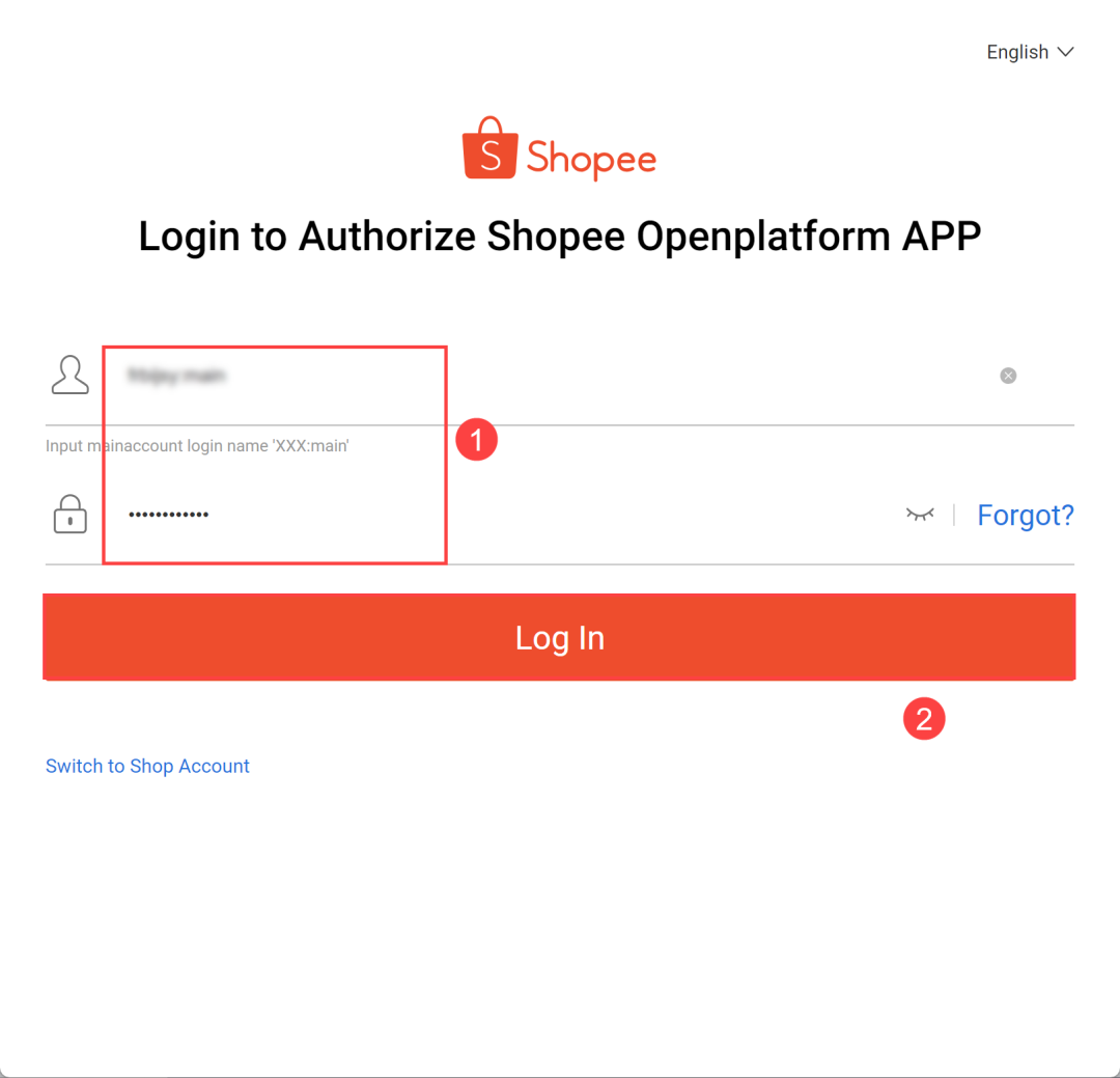 3)在登录页,选择对应区域。请使用 main account 登录 Shopee 平台。如下图所示: