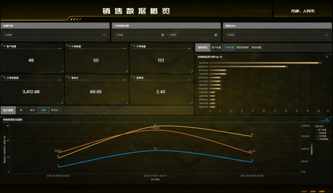 - 支持按店铺、SKU、时间段查看销售数据,快速评估商品的销售趋势;