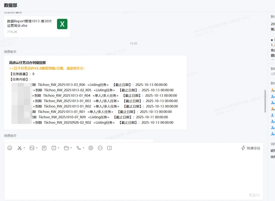 当日到期、已经延误的工作待办会通过数跨境的定时任务推送到工作群中进行提醒。