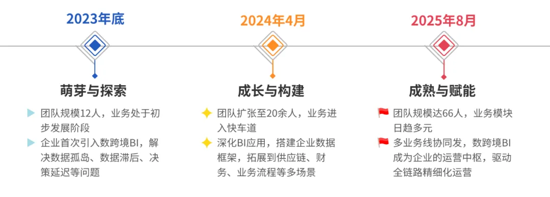 截至2025年8月,企业规模已扩至30人,多业务线协同发展,数据从支撑工具跃升为核心资产,数跨境BI成为企业的运营中枢,助力企业加速迈向数字化精细运营的新阶段。