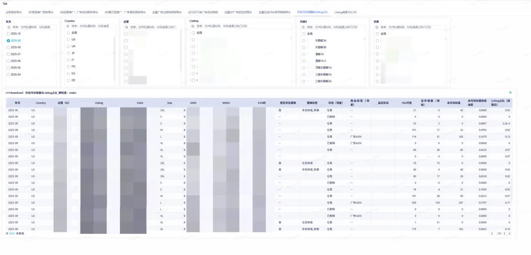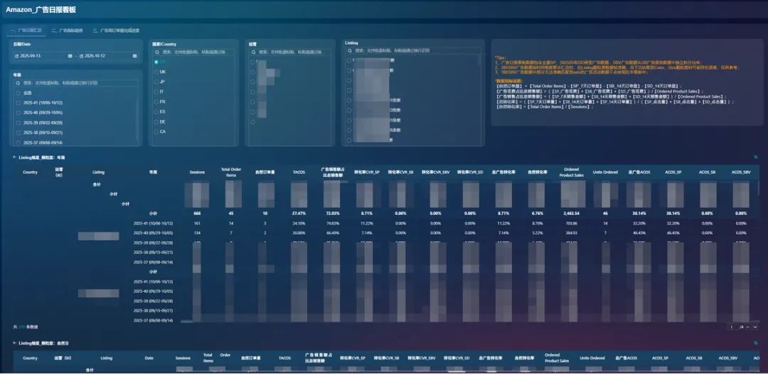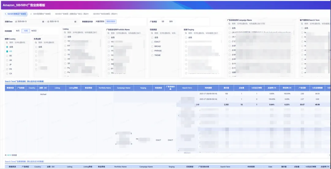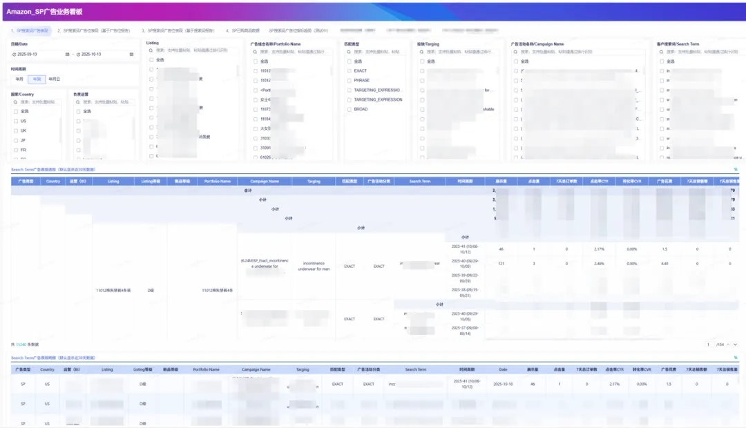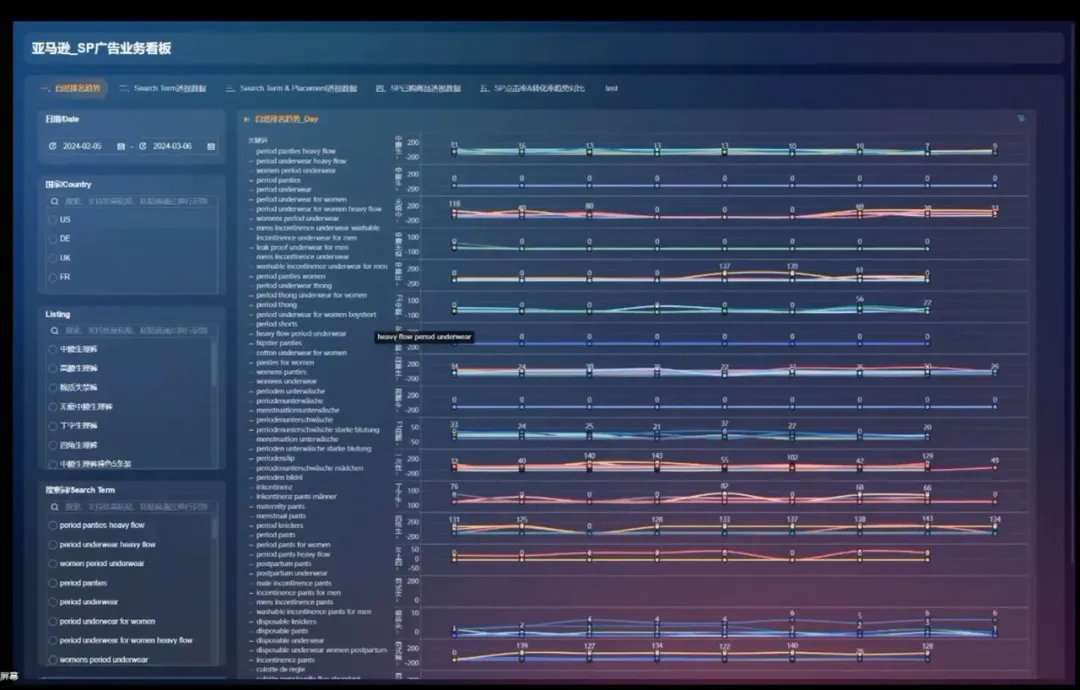 通过设置不同tabs,对自然流量、搜索词、展示位、SP商品进行快速切换,实现按照不同国家、listing、搜索词下不同投放数据的一屏全览。运营人员可以从自然流量切入,逐步下钻到搜索词、广告位和具体商品,实现全链路跟踪。