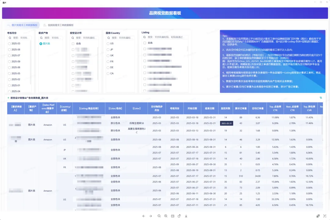 任务完成后,优化的Listing及对应视觉负责人的信息会自动回填至数跨境BI,并与“数据采集中心”中整理好的销售表现数据打通。