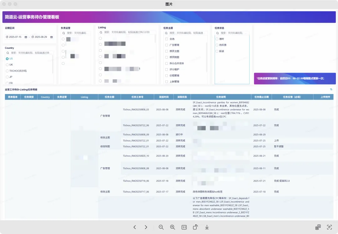 数跨境BI通过对简道云流程信息的同步,搭建运营事务代办看板,实时追踪任务状态、执行反馈及完成进度,让问题定位与落实一目了然。