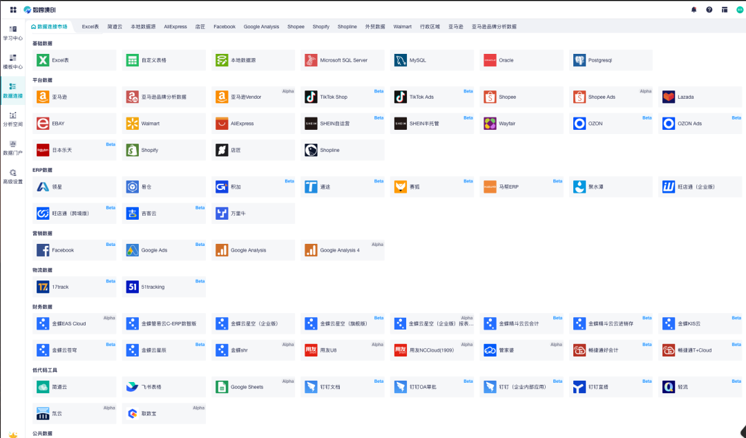 通过使用数跨境BI搭建数据中台,企业逐步打通了核心数据源: